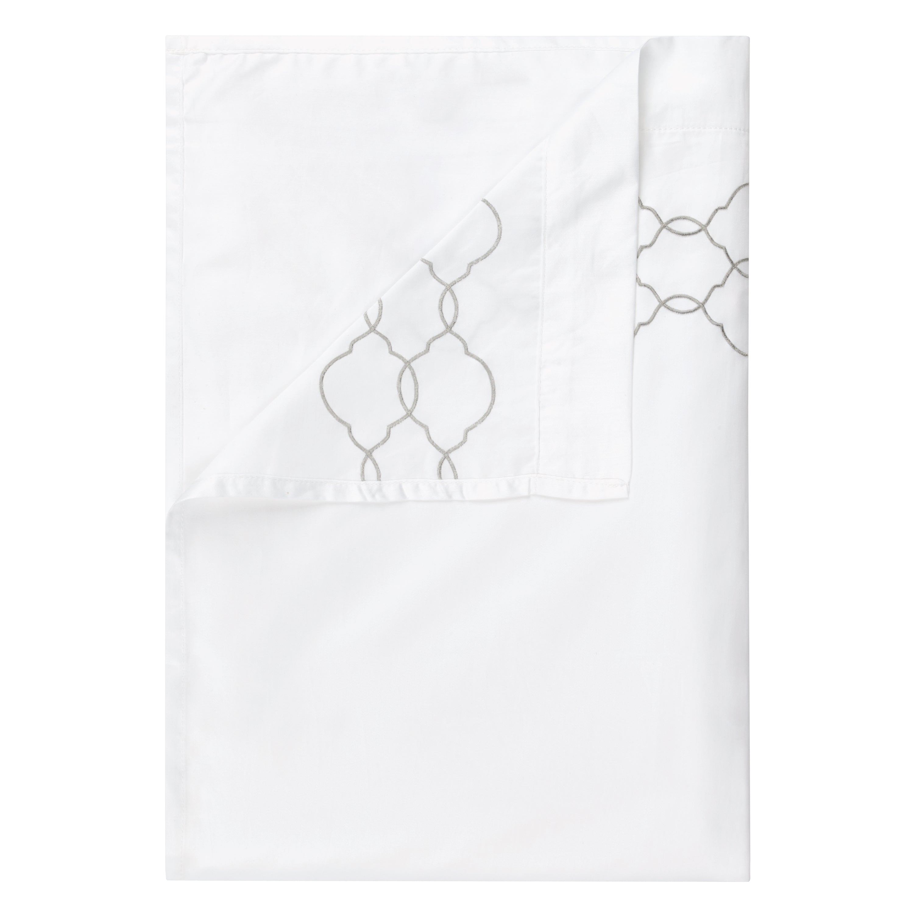 This sophisticated bedding design features an inky and watercolor contemporary take on the classic damask pattern. Large scale scrolls and damask motifs in tones of gray with a tiled pattern border edge. This statement bedding design is digitally printed onto 300 thread count cotton sateen.