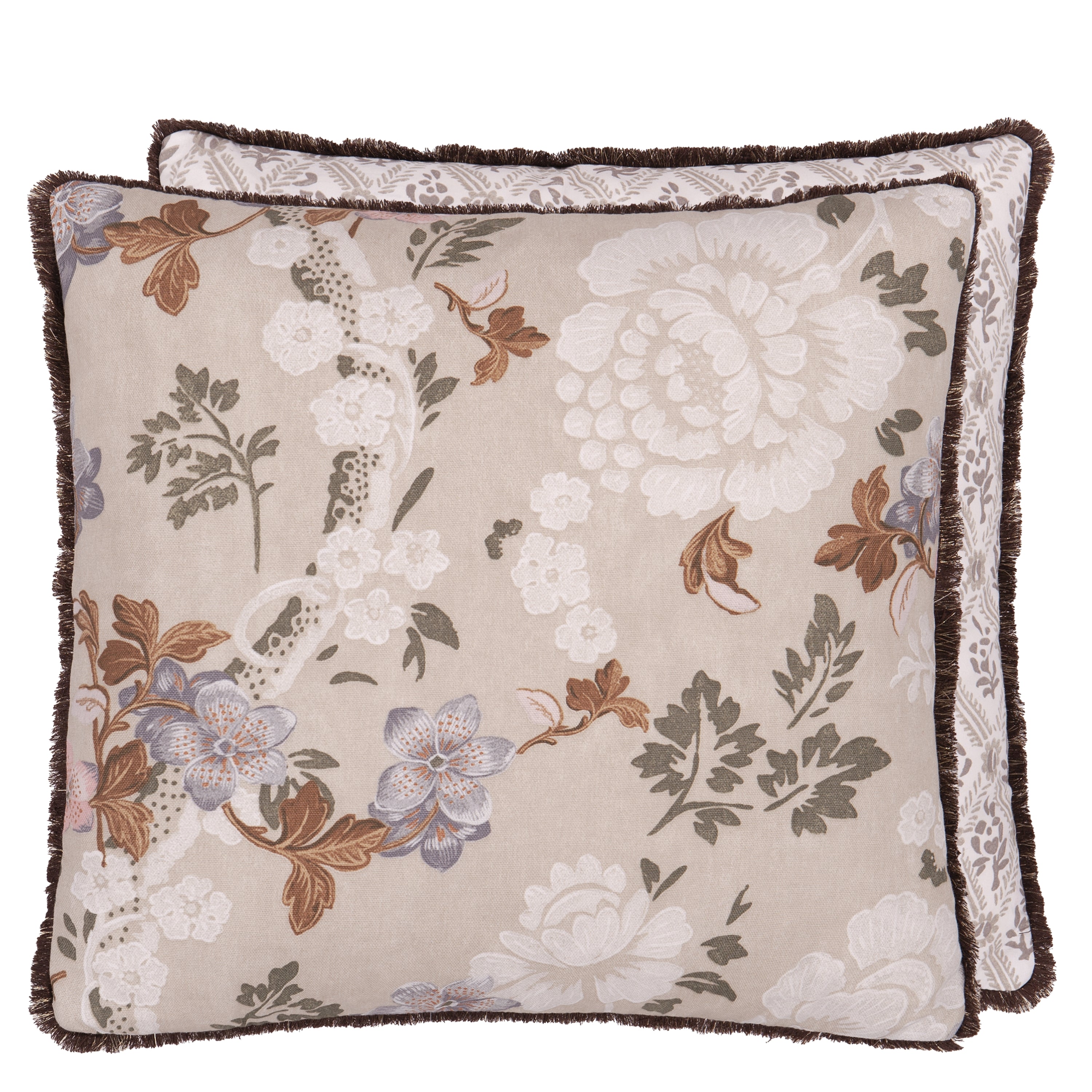 A stunning floral trellis cushion with bold block printed style flowers, paired with the small scale St John Street Trellis in seagrass. Finished with a brush trim.