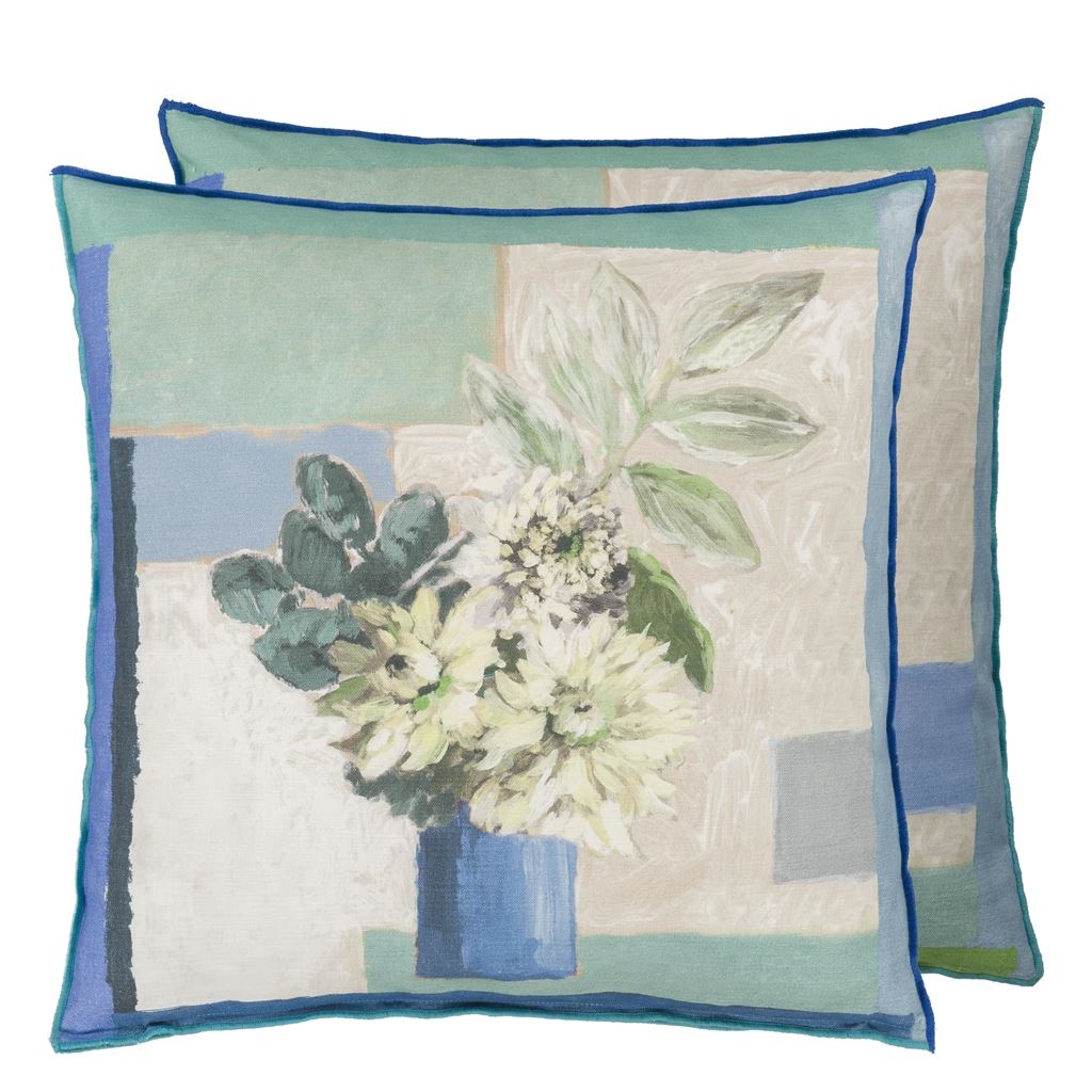 This stunning embroidered decorative pillow features two graphic floral bands in stunning indigo blue and emerald green, expertly hand finished with French knots and stitching details onto a cotton canvas ground. Completed with Tortona in swedish blue on the reverse.